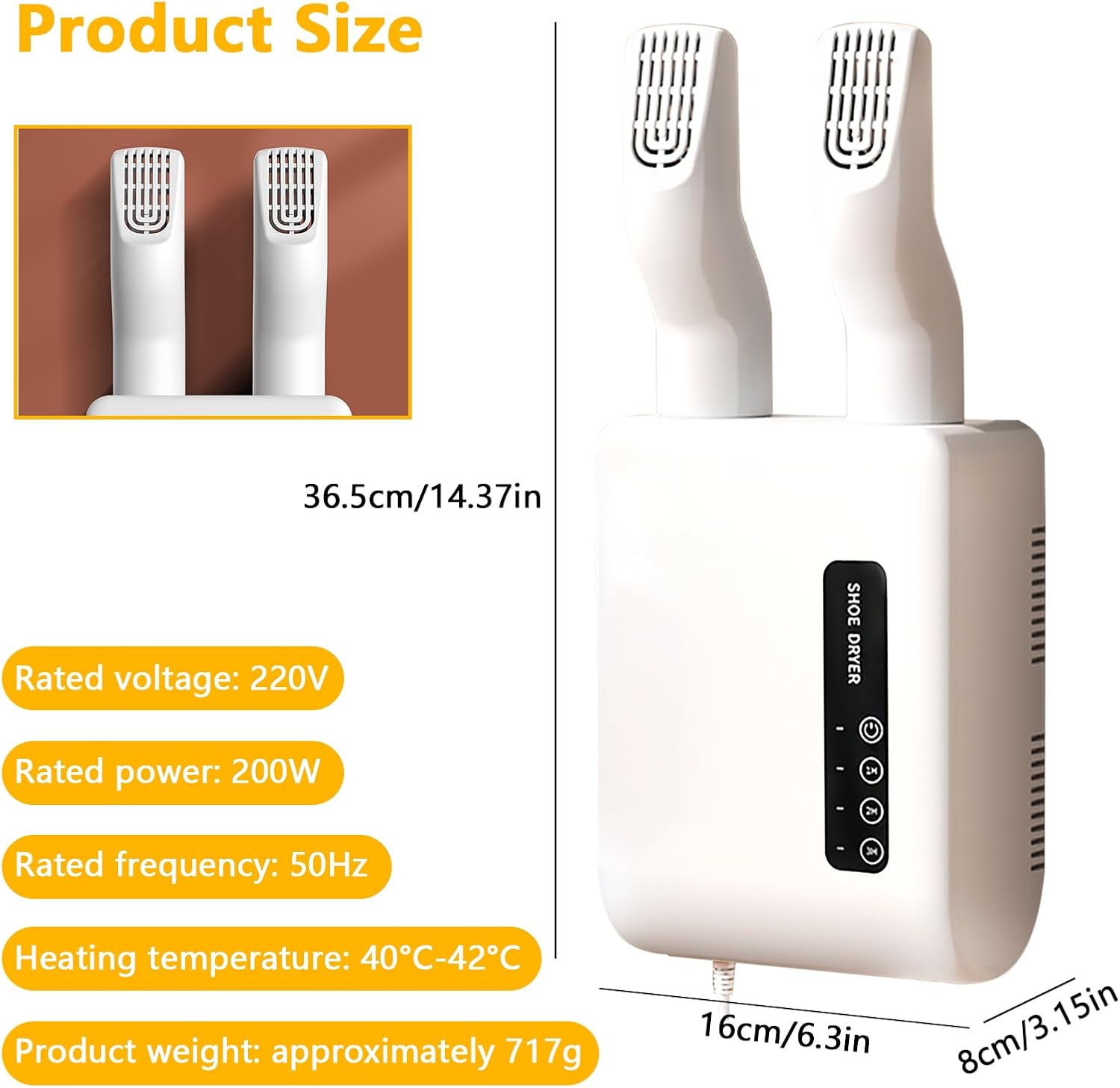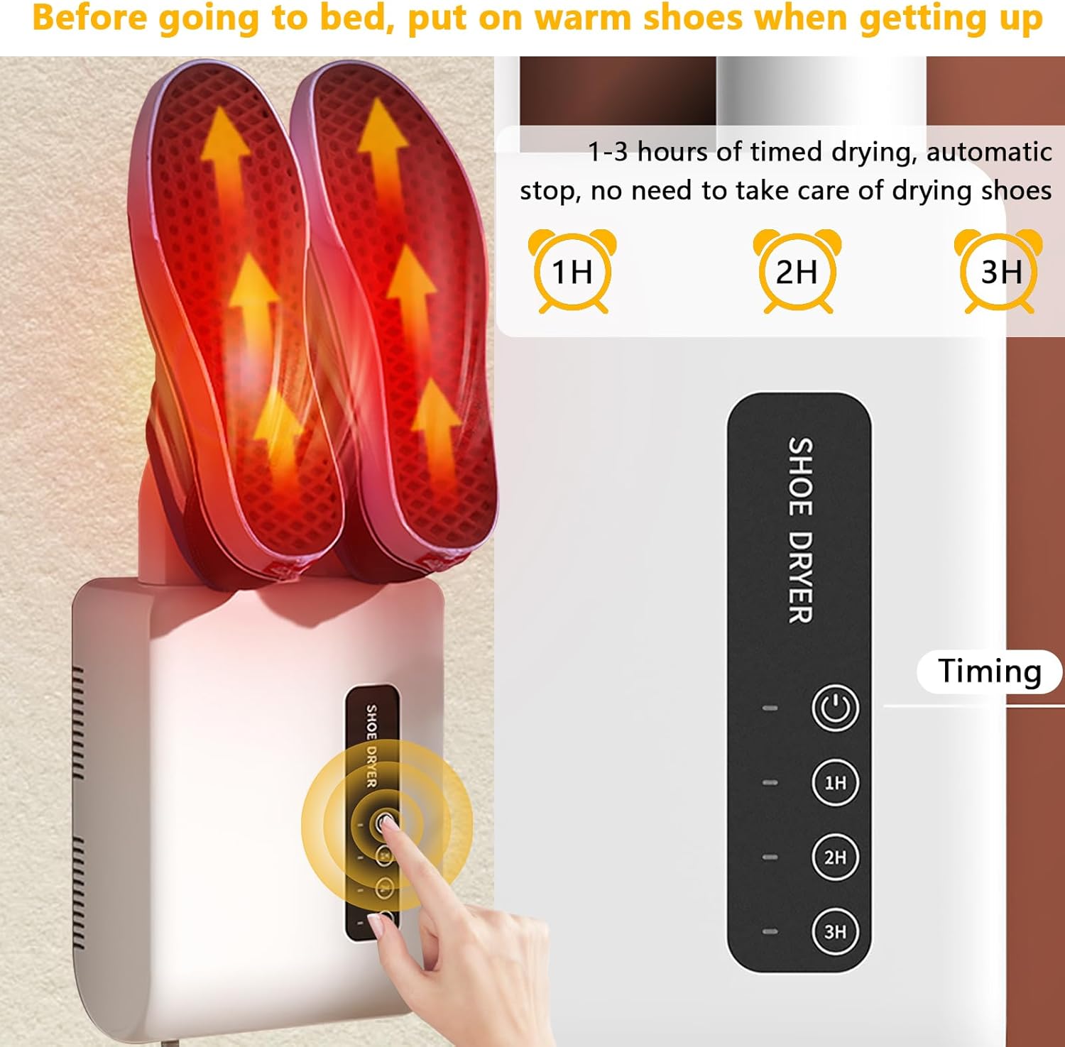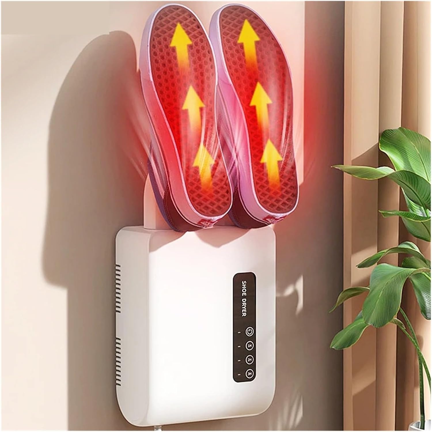 Sig farvel til våde og kolde sko med denne smarte "Elektriske Sko- og Fodvarmer med Timer". Den vægmonterede varmer er ideel til både hjemmet og kontoret, og sikrer hurtig tørring af sko, handsker og meget mere – samtidig med at den sparer energi og fjerner ubehagelig lugt.