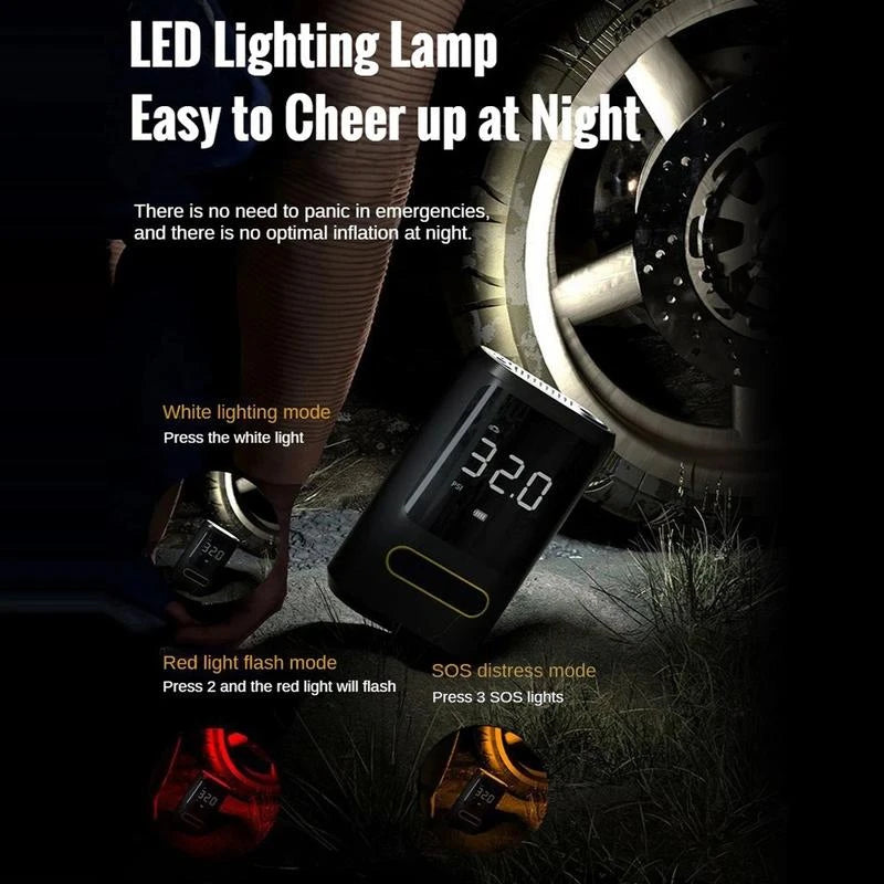 Vær klar til enhver situation på vejen med "Bærbar dækpumpe og powerbank" – en kompakt, men kraftfuld enhed, der kombinerer tre uundværlige funktioner: en kraftig kompressor, en pålidelig powerbank og en lysstærk LED-lommelygte. Uanset om du har brug for at pumpe et dæk, oplade din telefon eller finde vej i mørket, har denne minipumpe din ryg.