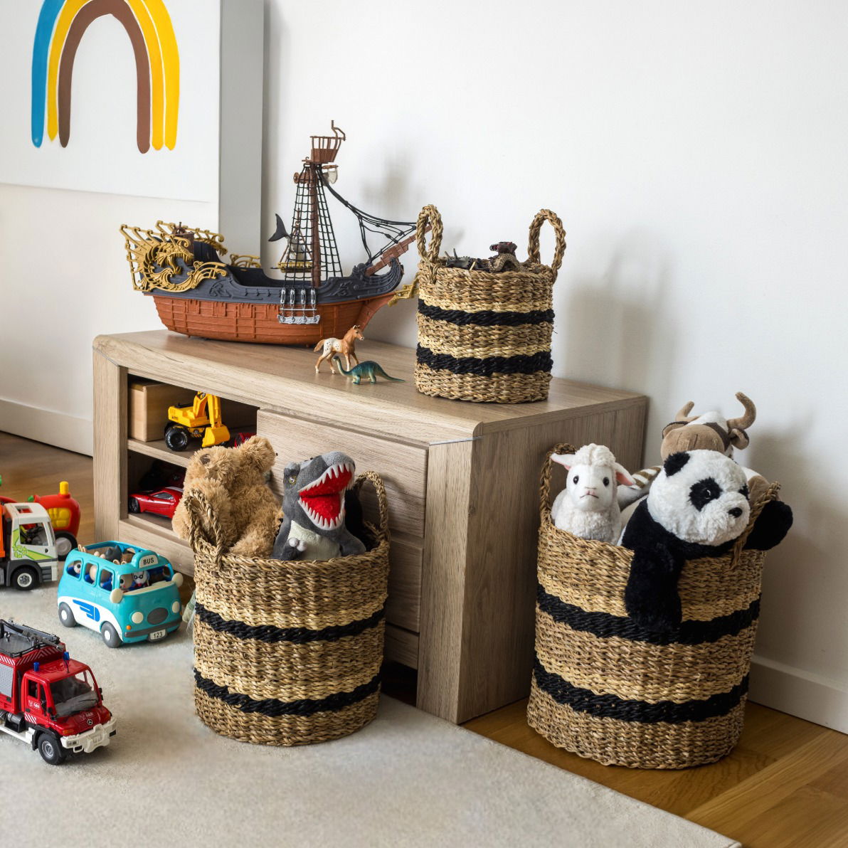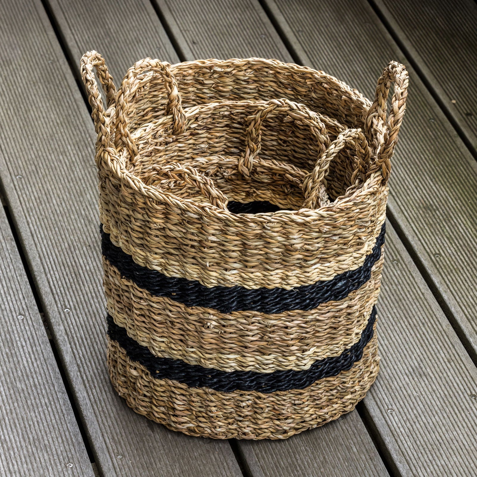 Kurvene er lavet af naturligt søgræs og giver et let og luftigt udtryk, samtidig med at de tilbyder praktisk opbevaringsplads. Perfekt til dig, der ønsker at organisere med stil.