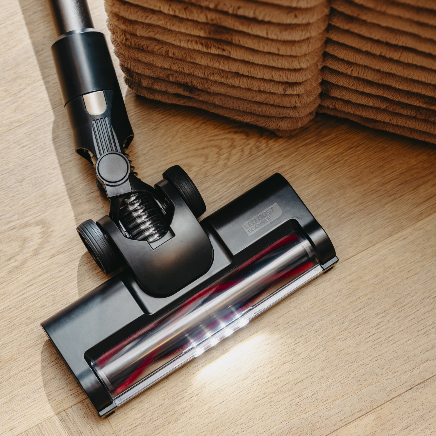 Børsten roterer automatisk og oplyser gulvet, så du let kan se og fjerne støv i mørke områder som under møbler og senge.